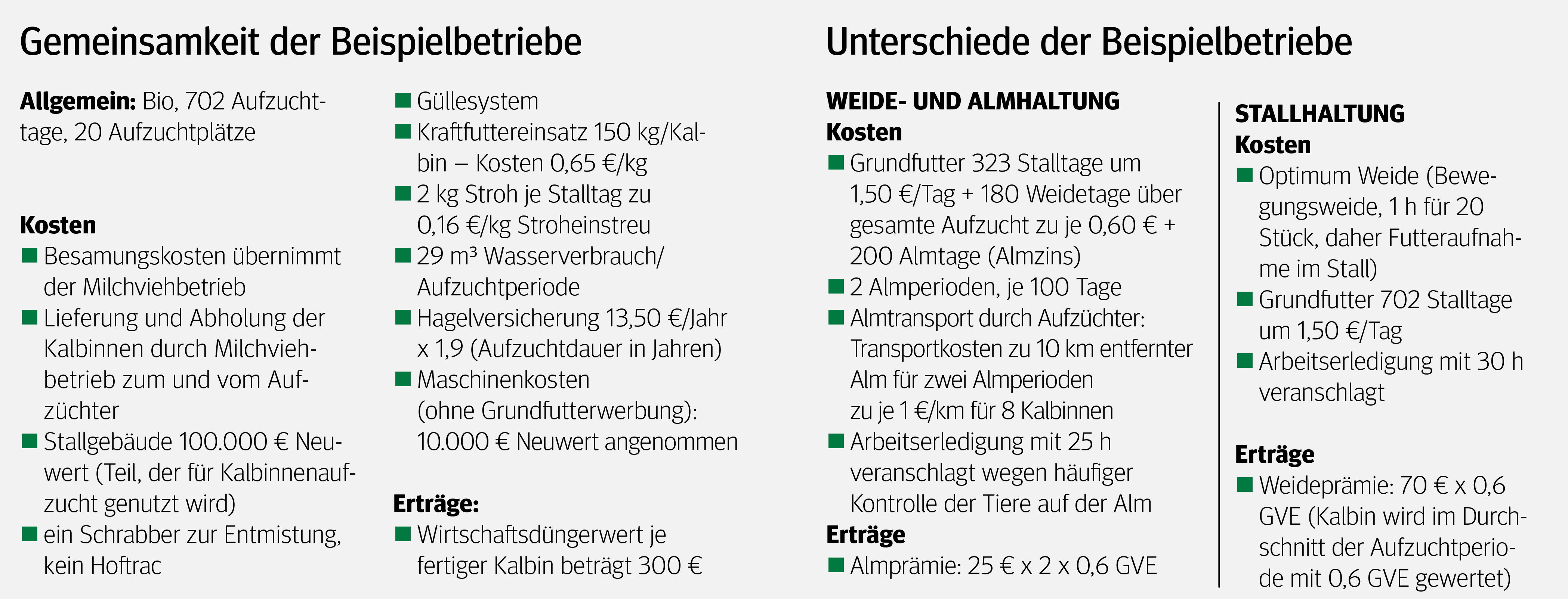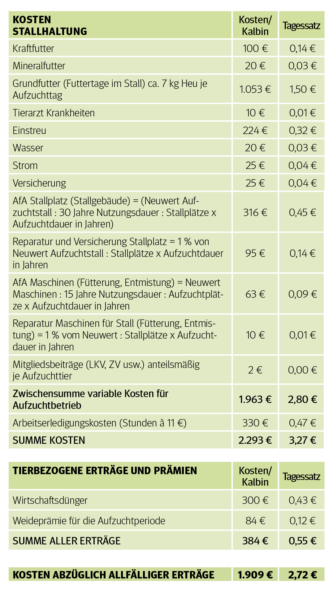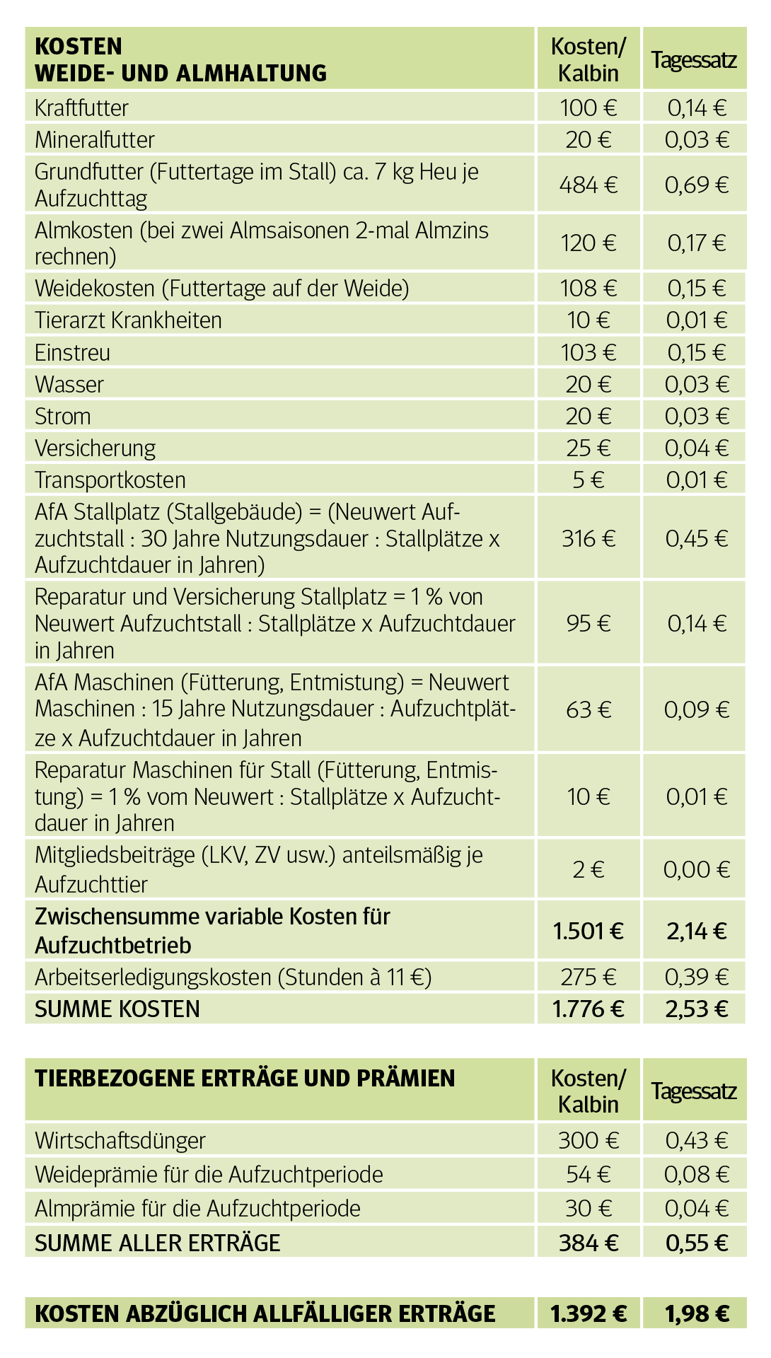 Die Berechnungsgrundlage bildet die Aufzuchtdauer, wenn ein Tagessatz ermittelt werden soll. Werden die Tiere vom Aufzuchtbetrieb als eigene Tiere geführt (z.B. Zukauf der Kälber), sind die Kosten für das Kalb zu berücksichtigen. In der Tabelle werden sowohl die anfallenden Kosten pro Kalbin als auch der Tagessatz pro Kalbin ausgewiesen. Bei Kälbern, die noch nicht abgesetzt sind, fallen Aufwendungen für Milchaustauscher bzw. getränkte Milch an. Kraft- und Mineralfuttereinsatz sind mit zu bedenken. Je nach Haltungsform gliedert sich der Grundfutterverbrauch in Stall-, Weide- und Almtage auf. Für die Stallfütterung wird mit einem durchschnittlichen Grundfuttereinsatz von 7 kg Heu je Kalbin und Tag gerechnet. Verbringen die Tiere den Sommer auf einer Alm, wird der Almzins pro Kalbin herangezogen. Werden die Tiere geweidet, so sind die Kosten für die Weide anteilig pro Kalbin mit zu erfassen. Für die Berechnung der anfallenden Weidekosten sind alle Investitionen rund um die Weide relevant. Angefangen von Zaunzeug über Saatgut bis hin zu Pflegearbeiten.