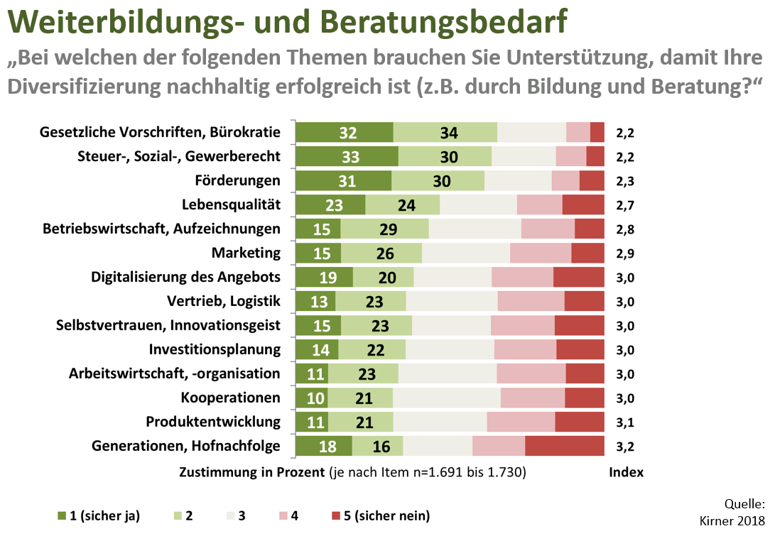 Gerade für Betriebe, die zusätzlich zur klassischen Urproduktion Einkünfte aus weiteren Standbeinen erfolgreich erwirtschaften wollen, sind Beratungs- und Bildungsangebote besonders wichtig. Laut der "Studie zur land- und forstwirtschaftlichen Diversifizierung“ von Dr. Leopold Kirner, im Auftrag der LK Österreich gibt es ein breites Spektrum an Themen für die Weiterbildung und Beratung in der Diversifizierung.