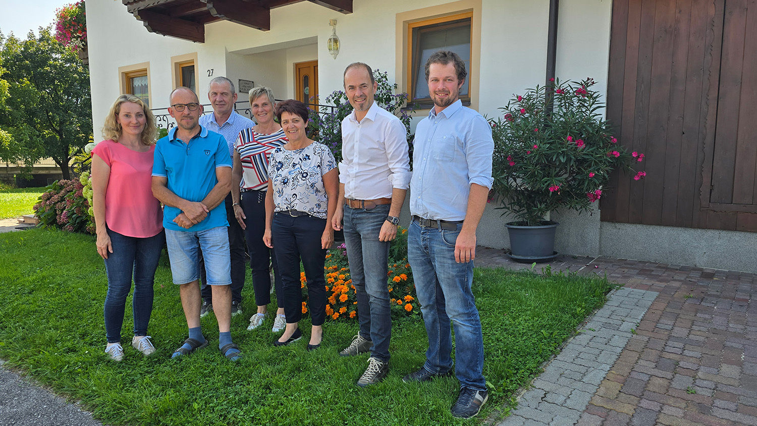 Als zweiter Betrieb wurde der Schleicherhof in Strass im Zillertal besucht. Monika und Martin Wildauer bewirtschaften den Hof mit Schwerpunkt Milchviehhaltung und bäuerlicher Vermietung. Der Betrieb wird seit über 25 Jahren als Bio-Heumilchbetrieb mit Kombinationshaltung geführt. Während die Milchkühe den Sommer über auf den direkt an den Hof angrenzenden Weiden verbringen, wird das Jungvieh auf die Gemeinschaftsalm Weissenbach im Karwendel aufgetrieben. Probleme bereitet Familie Wildauer die aktuelle Planung rund um das Großprojekt „Hochwasserschutz Unterinntal“. Direkt hinter der Hofstelle ist ein Damm geplant, der nicht nur die Bewirtschaftung erschweren, sondern auch eine Erweiterung der Hofstelle unmöglich machen würde. Gerade im Hinblick auf die Weiterführung des Erbhofes würden der nächsten Generation Entwicklungsmöglichkeiten genommen. Die Delegation der Landwirtschaftskammer hat der Familie zugesichert, bei der Vermittlung mit den zuständigen Planer:innen behilflich zu sein und gemeinsam auszuloten, welche Alternativen es zum derzeitigen Entwurf gibt.