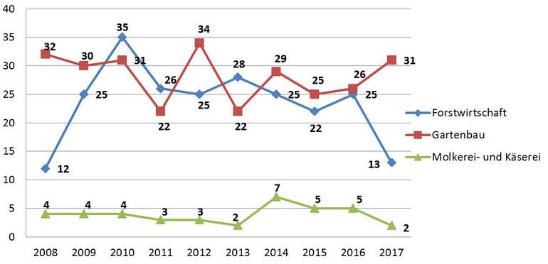 In der Tiroler Land- und Forstwirtschaft sind derzeit 73 Lehrbetriebe und zwei Ausbildungsbetriebe in der Lehrlingsausbildung aktiv. Mehr als die Hälfte der Betriebe bilden im Berufsbild Gartenbau aus. Weiters werden in den Berufsbildern Forstwirtschaft, Pferdewirtschaft, Molkerei- und Käsereiwirtschaft, Obstbau, Bienenwirtschaft und Landwirtschaft Lehrlinge ausgebildet. Die Abschlüsse von neuen Lehrverträgen bleibt im 3-Jahres-Vergleich annähernd gleich. Allerdings ist im Lehrabschlussvergleich der Jahre 2008–2017 auffällig, dass die Lehrlingszahlen in der Sparte Forstwirtschaft rückläufig sind. Die Abschlüsse über den zweiten Bildungsweg in der Forstwirtschaft hingegen steigen bzw. sind stabil.