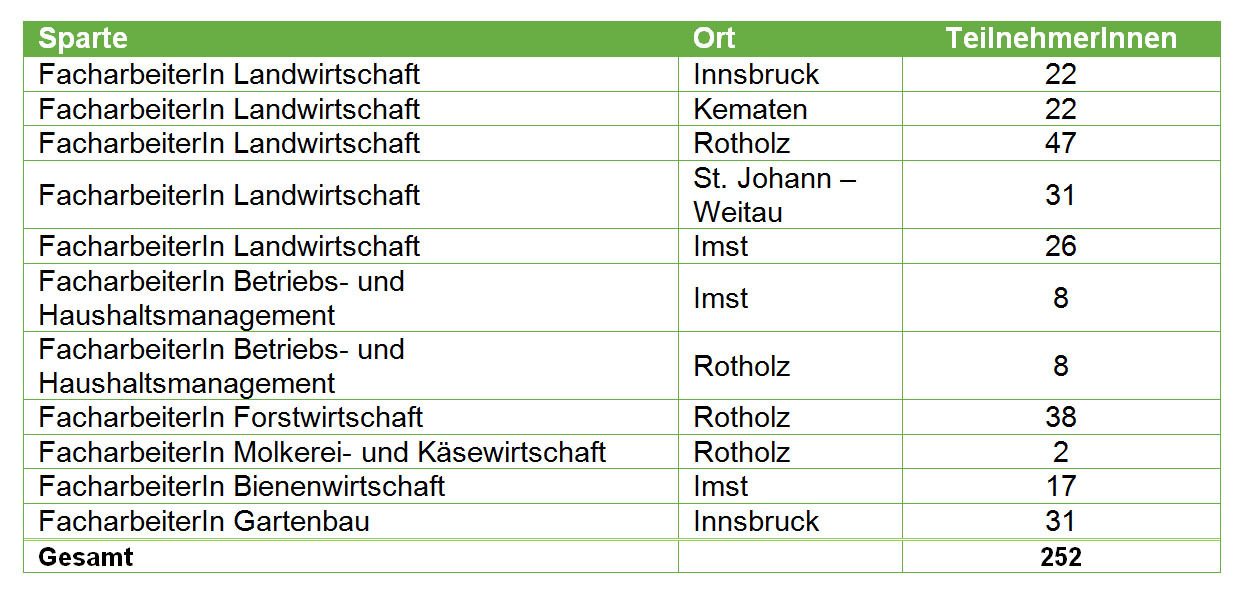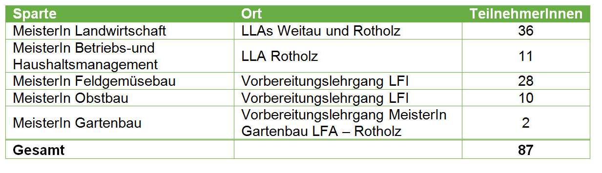 Der Bedarf an Aus- und Weiterbildung im zweiten Bildungsweg auf FacharbeiterInnenniveau in der traditionellen Berufsparte Landwirtschaft hält weiter an. Zukünftige BetriebsführerInnen mit Fachwissen und analytischen, lösungsorientierten Werkzeugen auszustatten, um damit eine erfolgreiche und gewinnbringende Weiterführung der Landwirtschaftlichen Betriebe zu ermöglichen ist hier das Ziel. Gemeinsam mit dem Landwirtschaftlichen Schulwesen wird an der Umsetzung einer kompetenzorientierten Ausbildung gearbeitet.