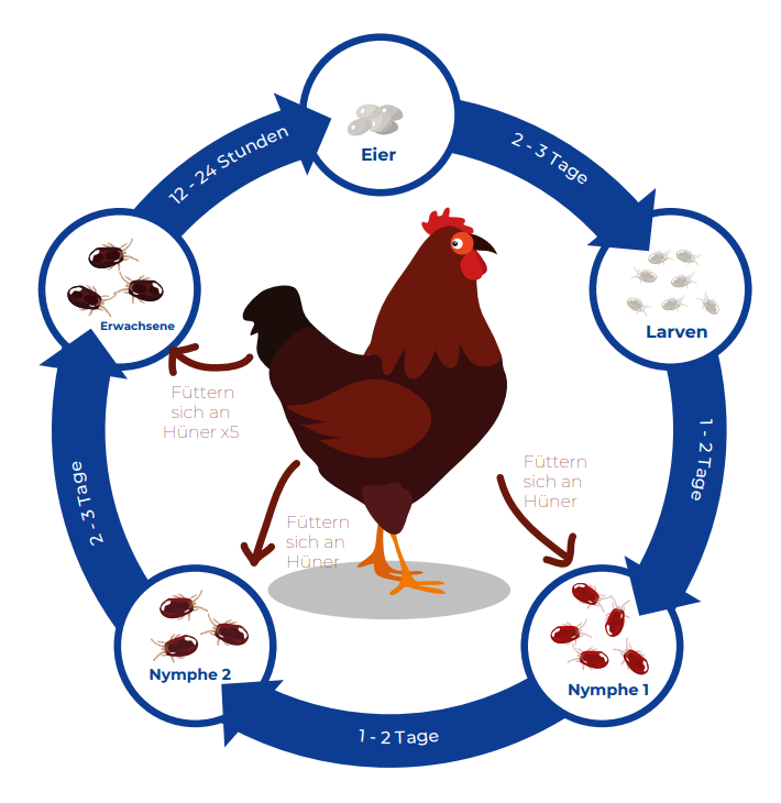 - Rote Vogelmilbe: Bis 1,5 mm große Milbe mit vier Entwicklungsstadien. Die Entwicklungsdauer ist temperaturabhängig, bei Wärme (über 25 °C) und Feuchte innerhalb einer Woche! Weibchen überleben im Schnitt etwa 20 Tage in leeren Hühnerställen, aber auch bis zu neun Monate. Tagsüber versteckt in Ritzen und Fugen, saugen Nymphen und erwachsene Milben in der Nacht bei den Hühnern Blut. Ihr Aktionsradius beträgt dabei rund 80 Zentimeter. Achtung: Auch Menschen werden als Fehlwirte befallen!