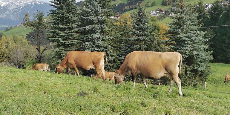 „Handsam, gutmütig, frühreif, weidegängig, fruchtbar, persistent und vor allem neugierig“, mit diesen Eigenschaften beschreibt Alois Geisler seine 13 Jeseykühe. 2009 hat der vormals erfolgreiche Braunviehzüchter umgestellt, um den bestehenden Stall nicht umbauen zu müssen. Nur die Aufstallung musste erneuert werden. Für die tägliche Milchabholung ab Hof waren damals 50.000 Liter jährlich nötig. Durch die kleinrahmigen und leistungsfähigen Jerseykühe konnte im bestehenden Gebäude mit mehr Tieren diese Marke erreicht werden. Mit drei Kühen hat der Landwirt vom Kolsassberg begonnen – und es wurden von Jahr zu Jahr mehr. Mittlerweile werden Tiere aus eigener Nachzucht ab Hof und im Vermarktungszentrum Rotholz angeboten.