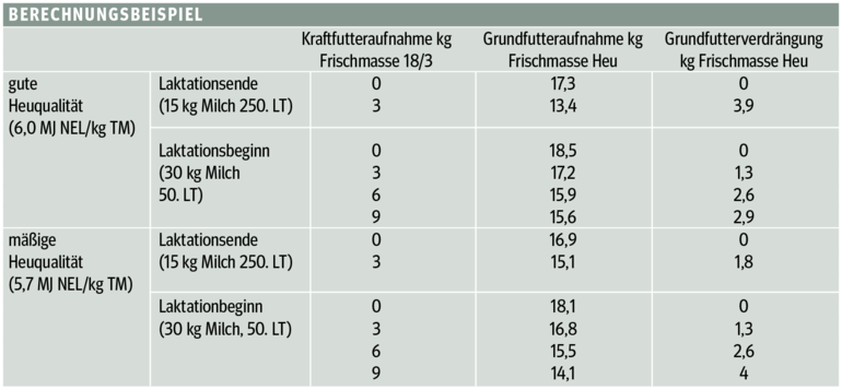 Wer eine solche Rechnung bei der Fütterung der Milchkühe anstellt, hat aber einen wesentlichen Einflussfaktor auf die Futteraufnahme von Rindern vergessen: die Grundfutterverdrängung durch Kraftfutter! Mit steigenden Kraftfuttergaben wird weniger Grundfutter gefressen. Wird die Energiemenge durch das zusätzliche Kraftfutter mit der Energiemengen des verdrängten Grundfutters gegengerechnet, so ergibt sich eine Milchleistung pro Kilogramm Kraftfutter von etwa 1,5 kg. Dieser Wert ist zu Laktationsbeginn etwas höher, am Laktationsende wesentlich tiefer.