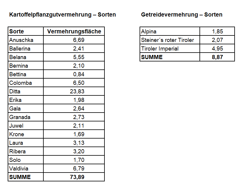 Die gesamte Saatgutvermehrungsfläche in Tirol beträgt 82,76 Hektar. Die Raiffeisengenossenschaft Osttirol und die Tiroler Saatbaugenossenschaft vermehren 73,89 Hektar Kartoffel.