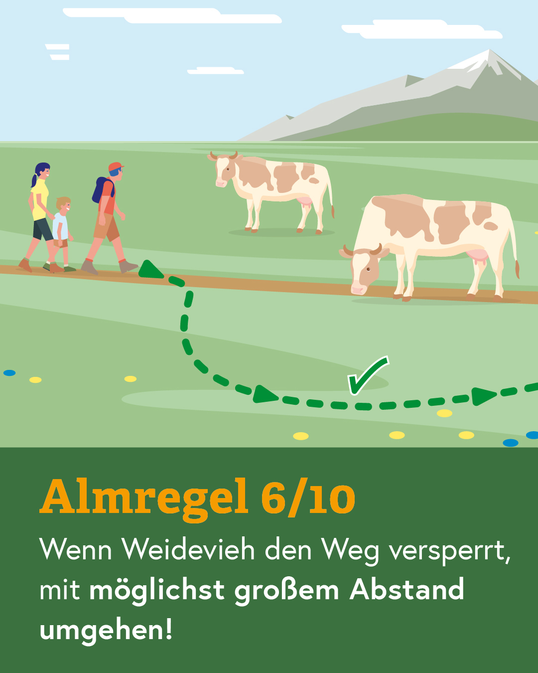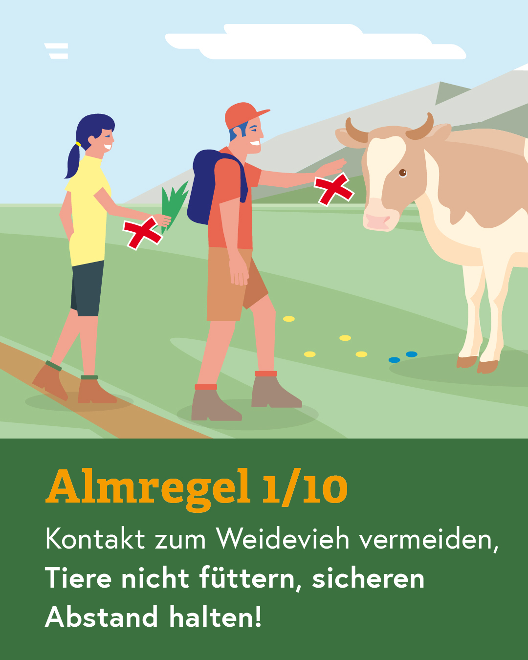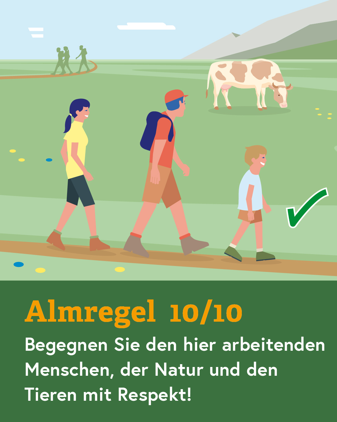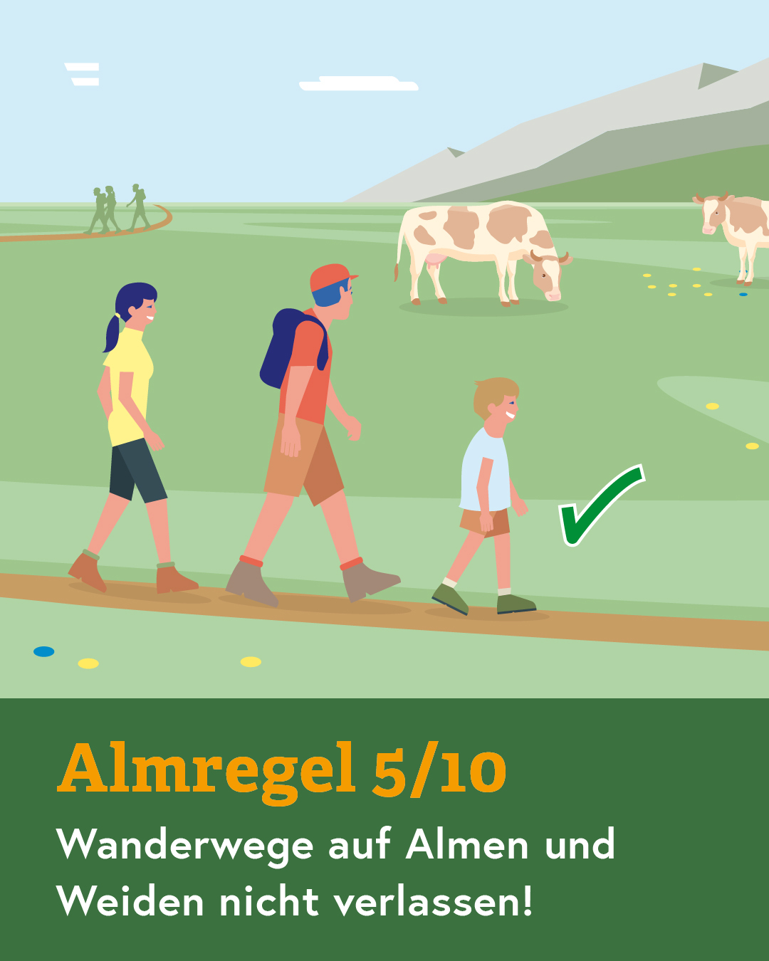 Wanderwege auf Almen und Weiden nicht verlassen!