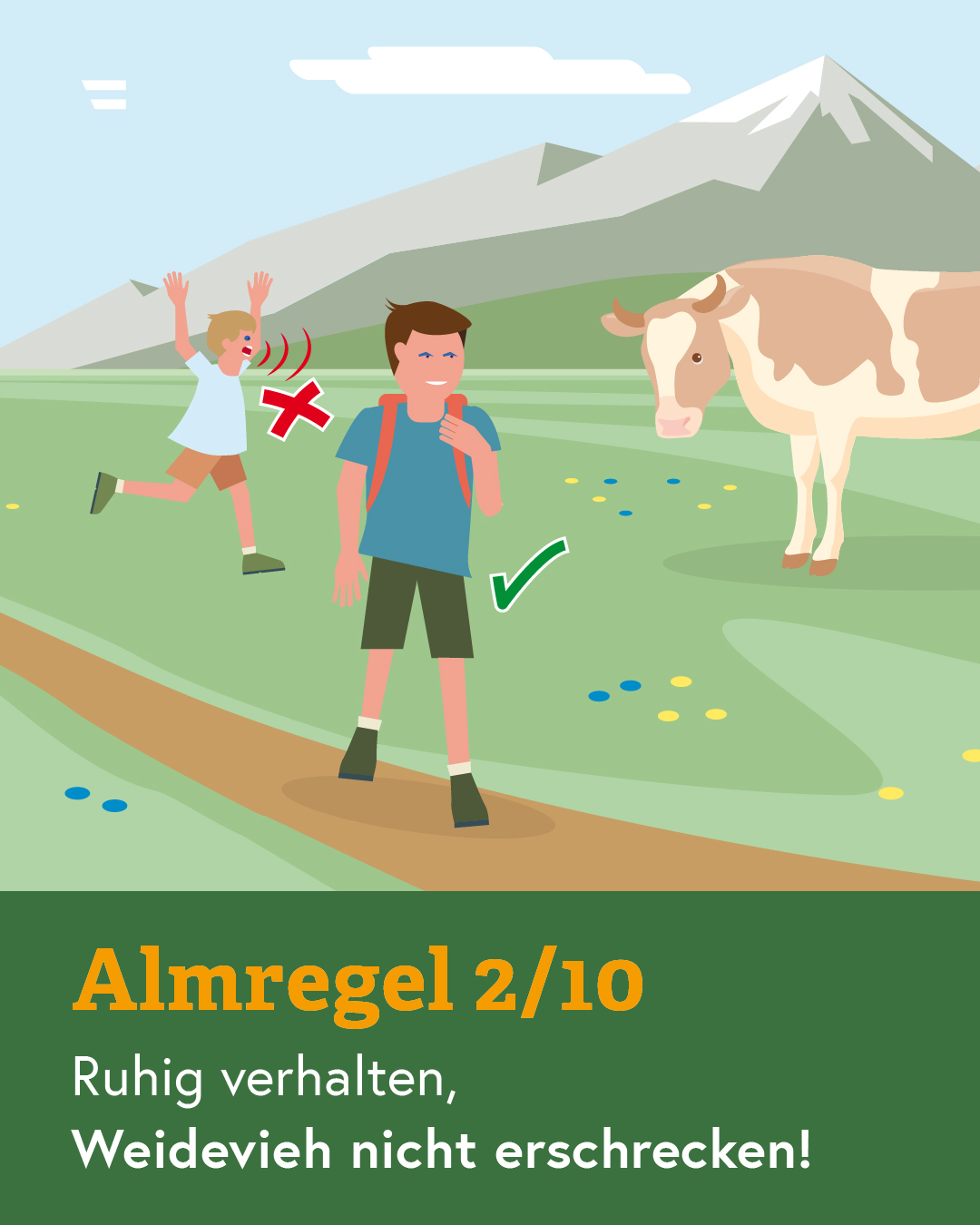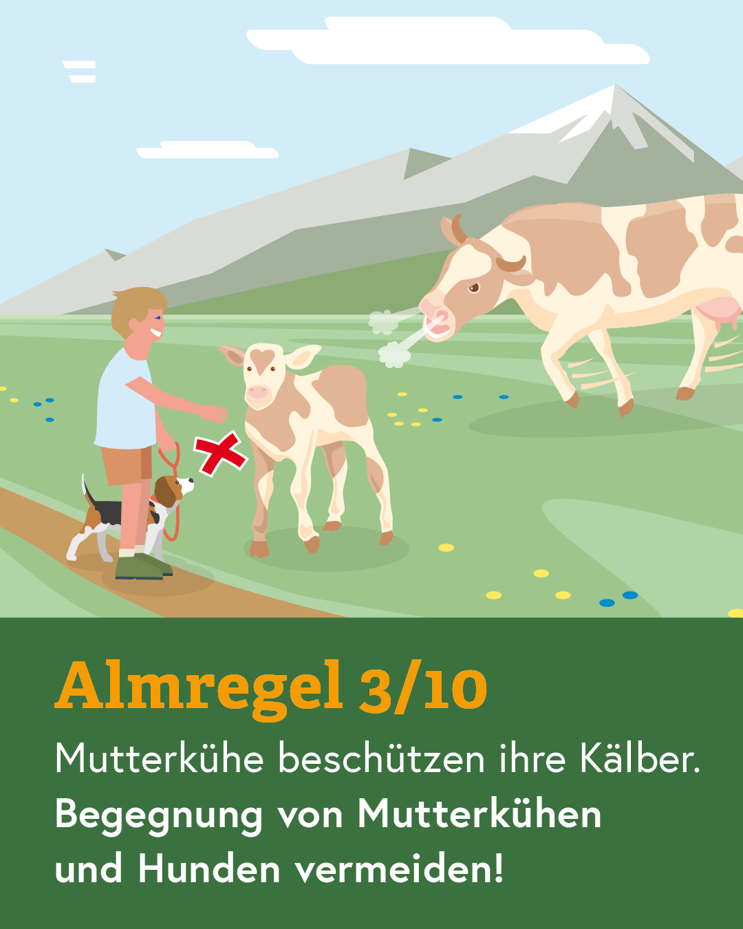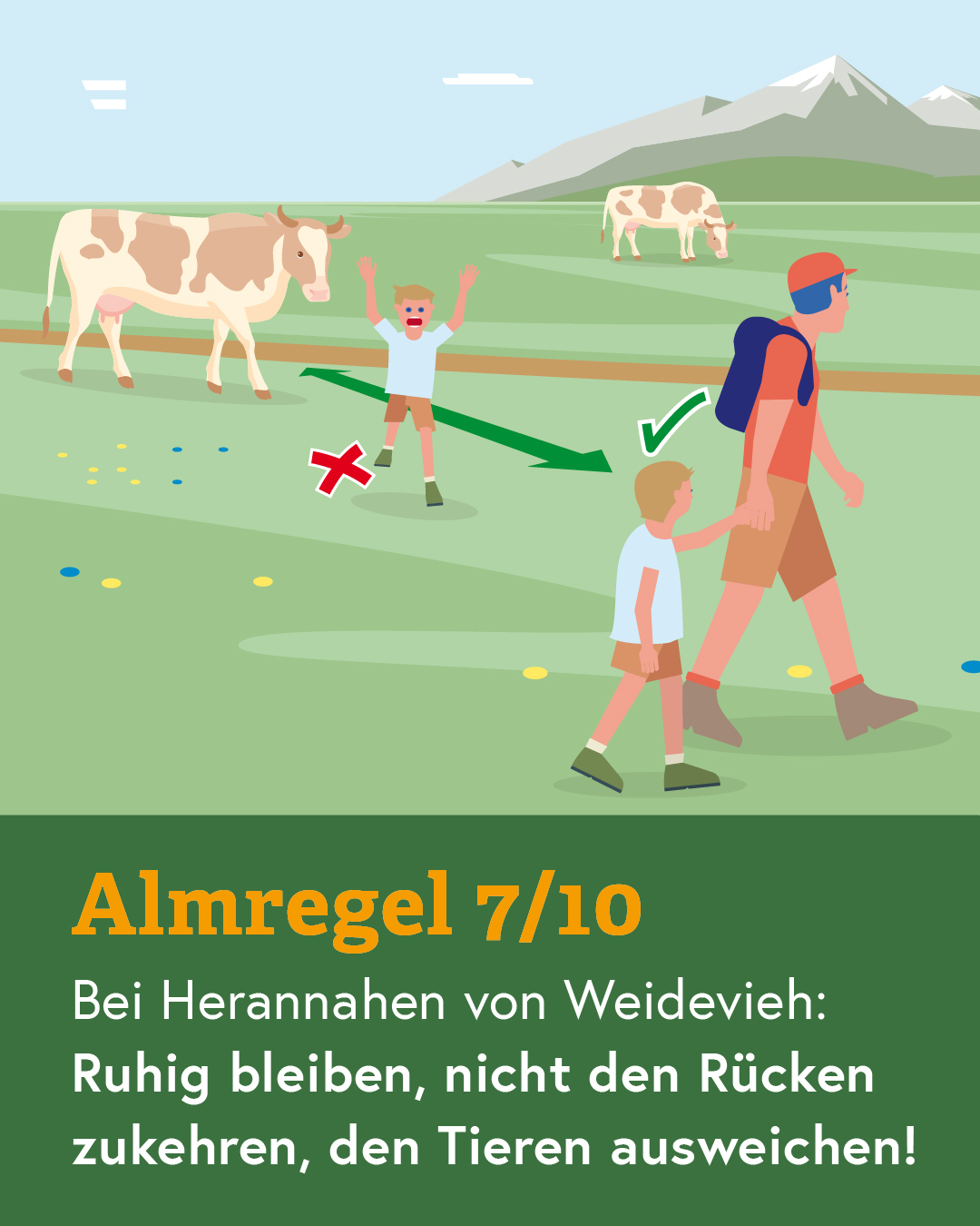 Mit über 2.000 Almen verfügt Tirol über die meisten Almen in ganz Österreich. Kühe, Kälber, Schafe, Pferde und auch Ziegen verbringen den Sommer auf den großflächigen Weidegebieten und erhalten dadurch die einzigartige Kulturlandschaft mit ihrer Artenvielfalt. Begegnungen mit Weidevieh sind daher recht häufig. Damit diese entspannt verlaufen, sollten folgende Regeln beachtet werden:
