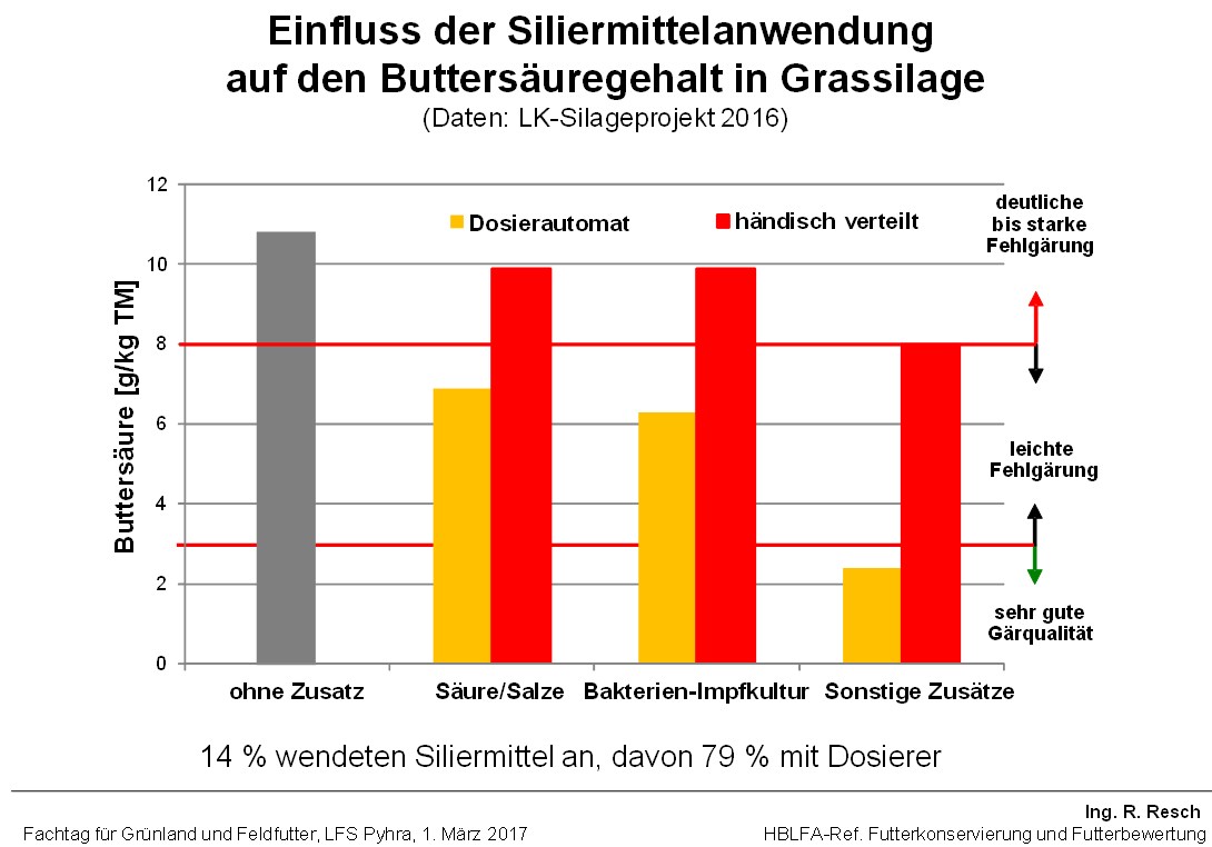 Einfluss der Siliermittelanwendung auf den Buttersäuregehalt in Grassilage (Daten: LK Silageprojekt 2016) © R. Resch
