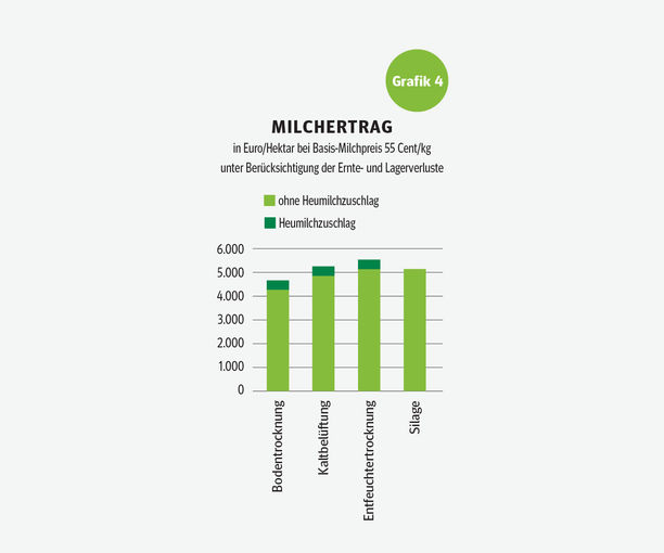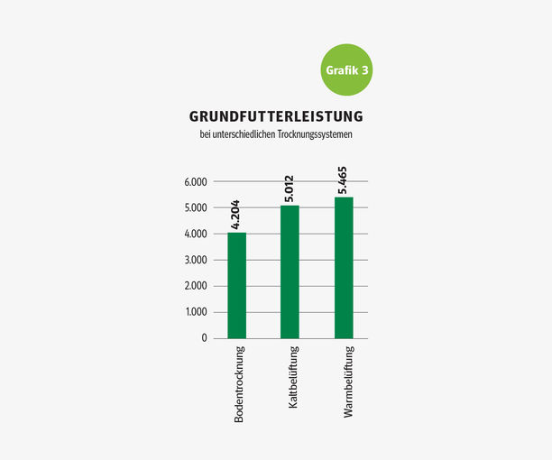 Das wichtigste Futtermittel und die Basis für die erfolgreiche Milchproduktion ist das Grundfutter. Gelingt die Konservierung vom Grundfutter nicht perfekt, muss das mit teuren Importfuttermitteln ausgeglichen werden. Dabei bleiben die Fixkosten am Betrieb gleich. Mit anderen Worten: Im Grundfutter steckt der Betriebserfolg! Die Grafiken 3 und 4 zeigen die steigende Grundfutterleistung, abhängig vom Trocknungssystem, sowie den Milchertrag je Hektar, abhängig vom Trocknungssystem.